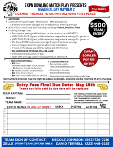 Join us at our EXPN Bowling Match Play Memorial Day Mayhem 2 Tournament!Β  See the flyer for details and sign up.